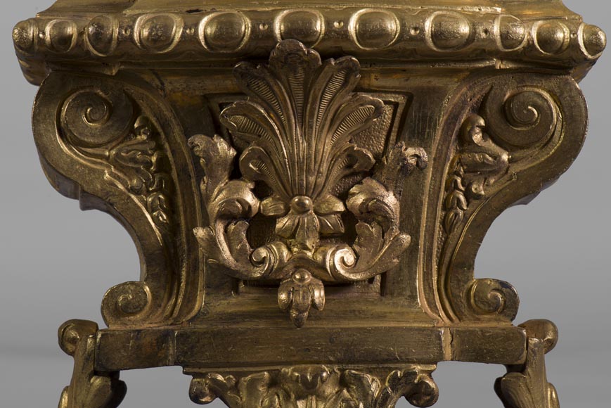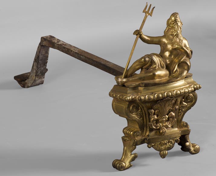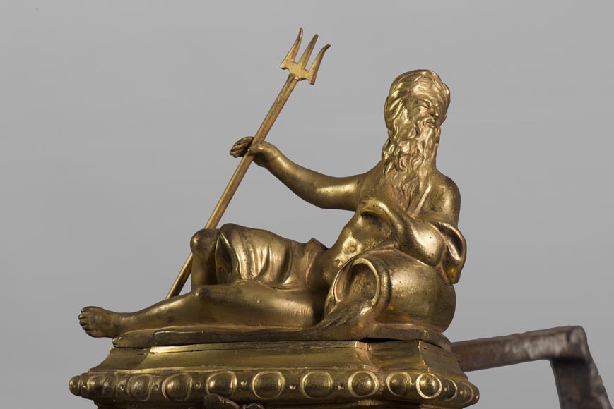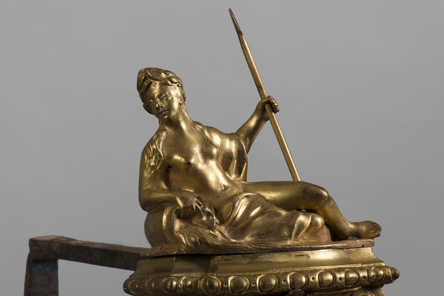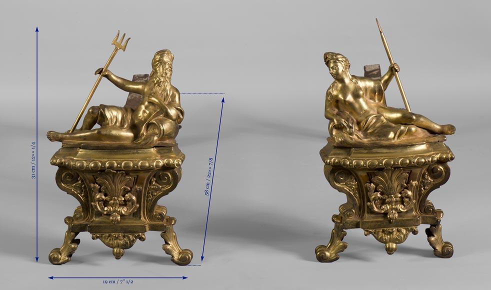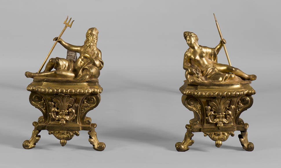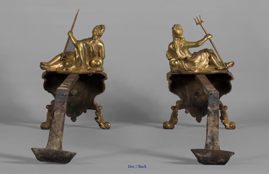"Le Fleuve et la Rivière", paire de chenets anciens en bronze doré