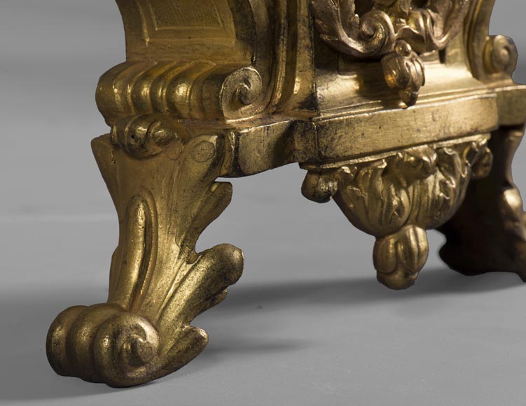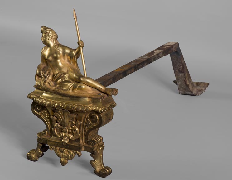 Charmante paire de chenets anciens en bronze doré de style Louis XIV réalisés au XIXè siècle. Décor avec allégories du Fleuve et de la Rivière. Les chenets sont pourvus de leurs fers d'origine.