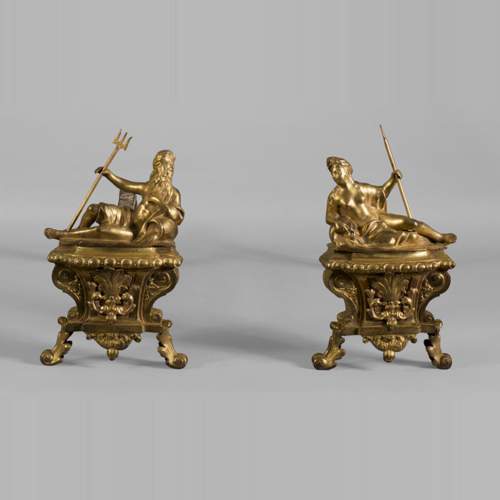 Paire de chenets de style Empire aux Sphinges, bronze doré et bronze à patine brune