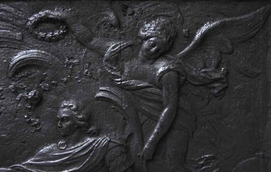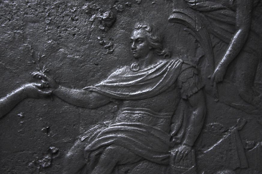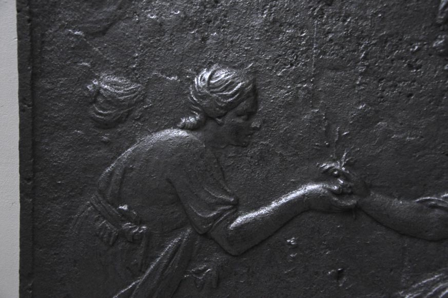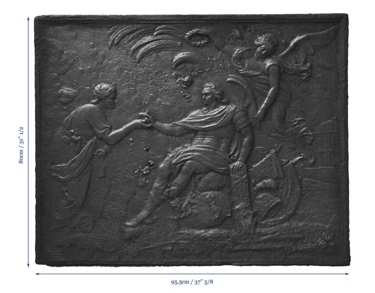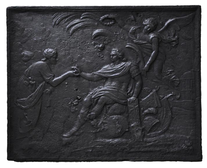 Cette plaque de cheminée ancienne de style Louis XIV fut réalisée au XVIIIè siècle. Un souverain, couronné de lauriers par la Renommée, donne l'aumône à une paysanne.