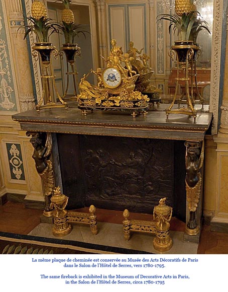 Une plaque de cheminée du même modèle est conservée au Musée des Arts Décoratifs de Paris, dans une somptueuse cheminée en marbre bleu Turquin et sphinges en bronze provenant du salon de l'Hôtel de Serres, vers 1780-1795.