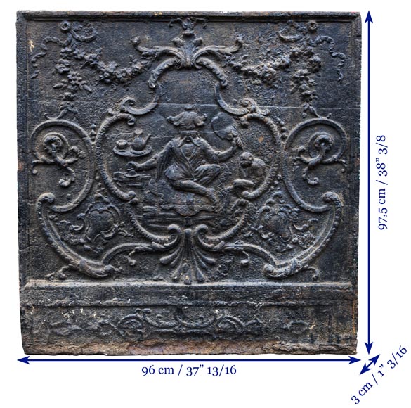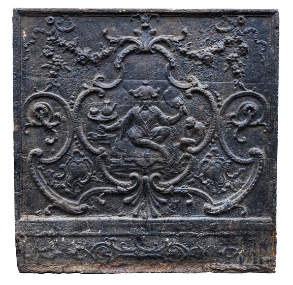 Cette plaque de cheminée est une édition du XIXe siècle d'après un modèle du XVIIIe siècle. Un personnage chinois sert le thé accompagné d'un petit singe. Le décor est inspiré d'un dessin de François Boucher (1703-1770).