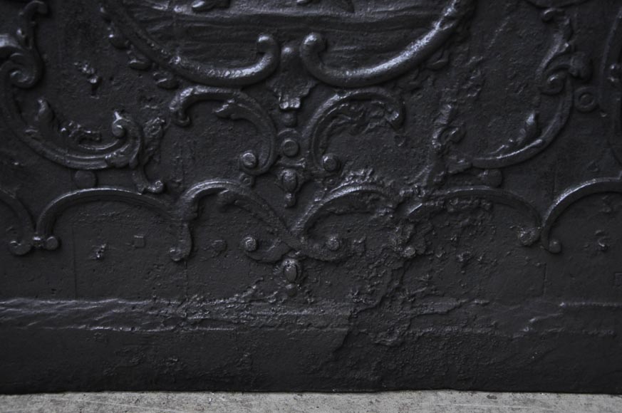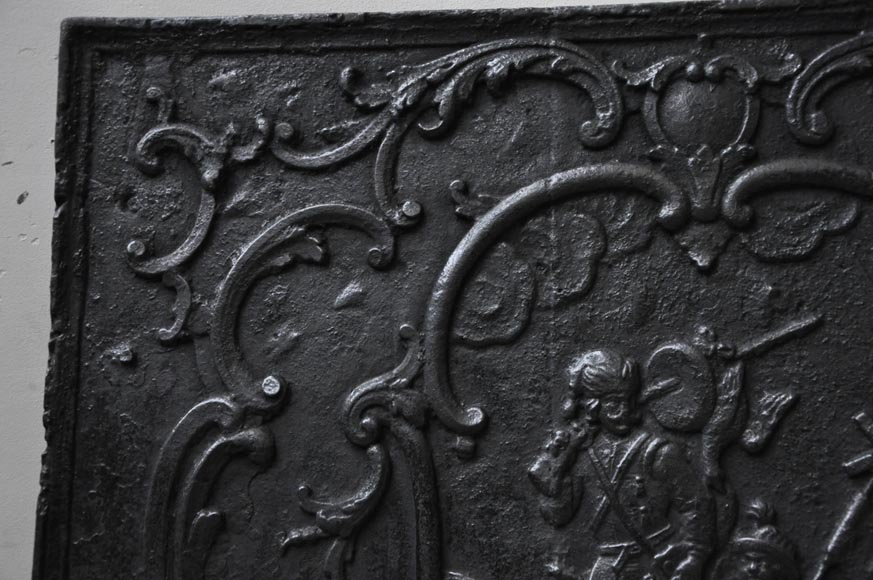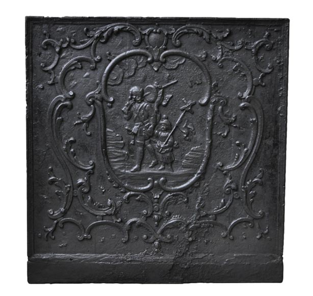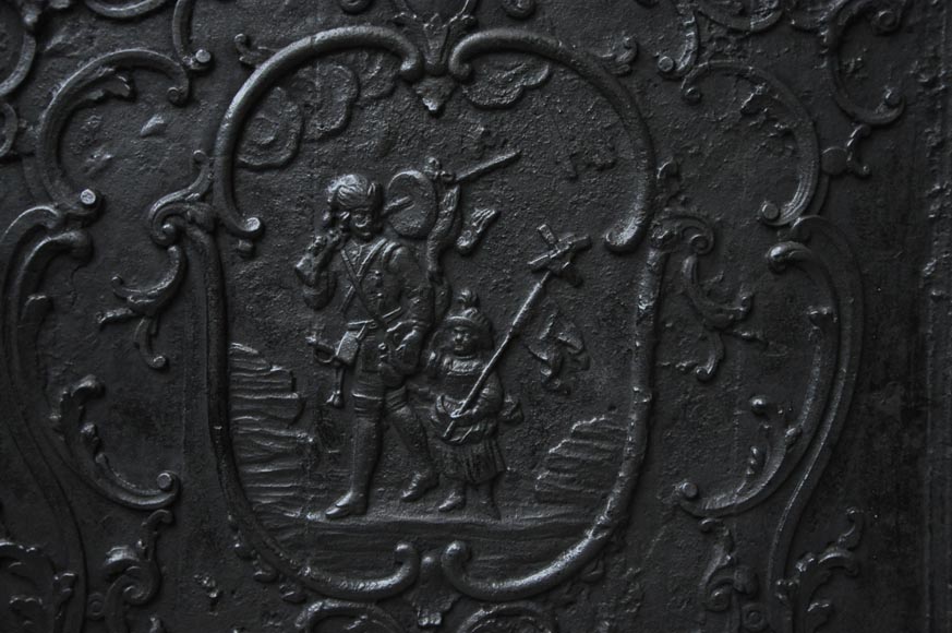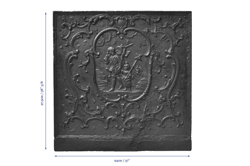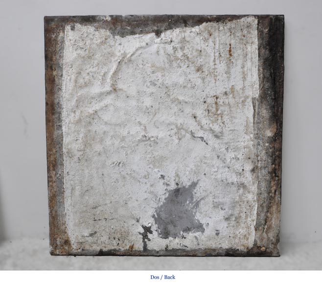 De format carré, cette plaque de cheminée ancienne fut réalisée au XVIIIè siècle. Dans un encadrement rocaille, deux chasseurs sont vêtus à l'orientale.