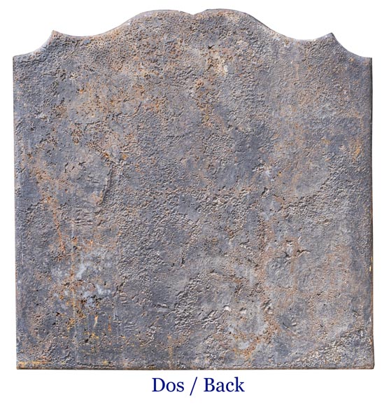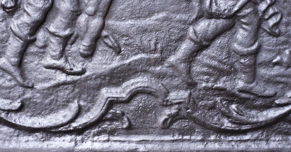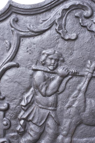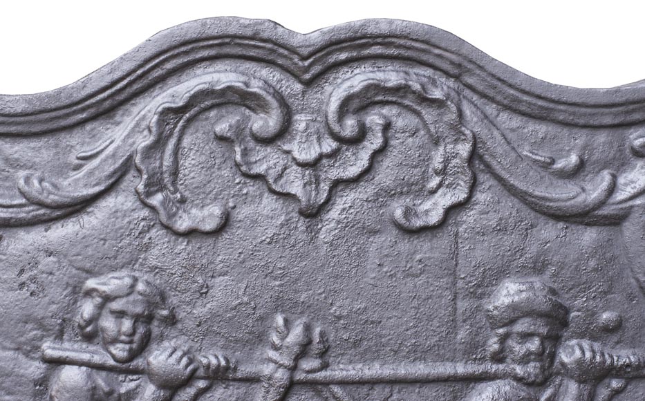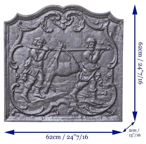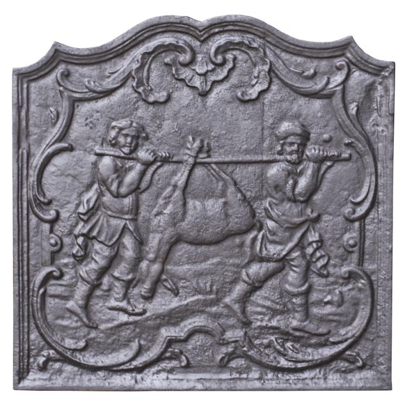 Réalisée au XXe siècle, cette plaque de cheminée en fonte illustre deux chasseurs rentrant avec leur gibier, probablement une biche.