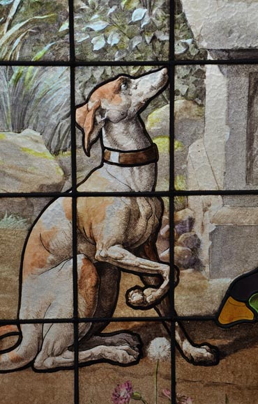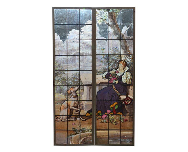 "La châtelaine au lévrier", double fenêtre en vitrail signée par Hubert et Martineau Paris