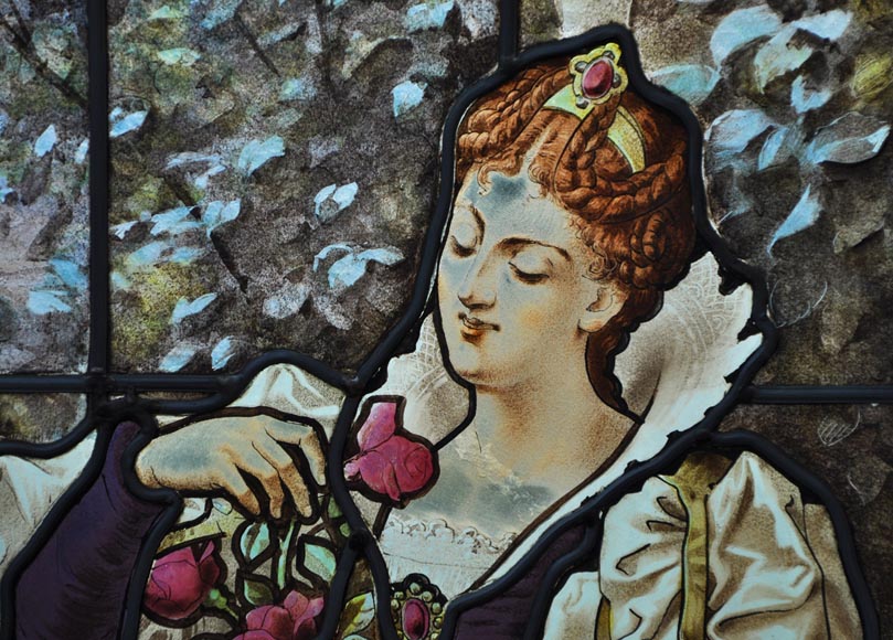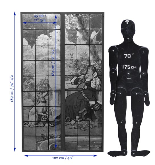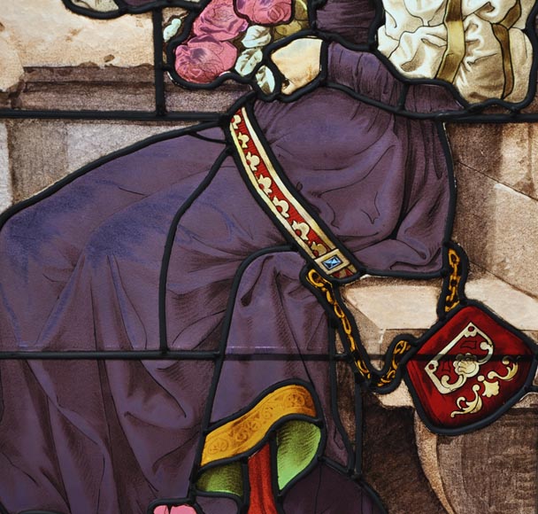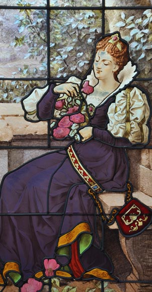 La double fenêtre représente une dame vêtue à la mode du XVIè siècle, se reposant sur un banc à côté d'un lévrier et d'un bassin d'agrément.