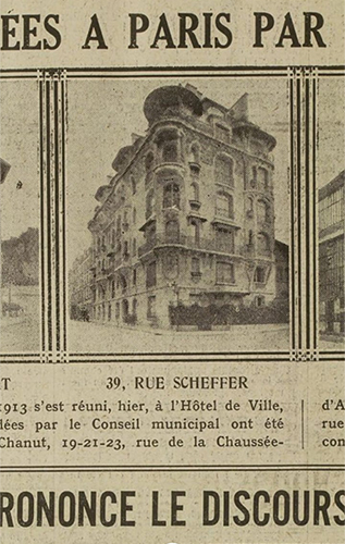 En 1922, un prix a été décerné à l’immeuble du 39 rue Scheffer, à l’occasion du concours de façade de la Ville de Paris où six immeubles ont été primés par le jury. Ce concours, créé en 1898 et qui perdura jusqu’en 1930, avait pour but premier d’inciter les architecte à construire des édifices originaux, qui étaient ensuite primés dans l’année de leur construction ou comme ici, a posteriori. Ce résultat est paru dans le journal Excelsior du 28 juillet 1922 avec une photographie du bâtiment et le nom de l’architecte.