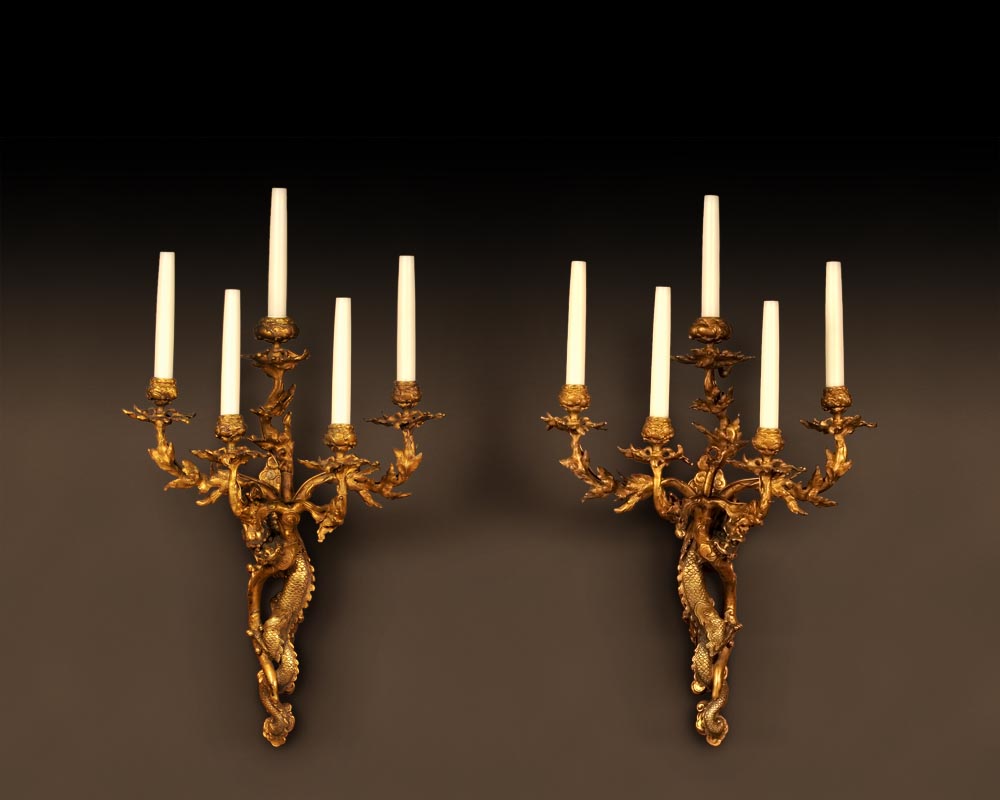 Cette paire d'appliques, anciennement attribuées à Edouard Lièvre, s'inspire des réalisations des plus dessinateurs tels Reiber ou Viardot.