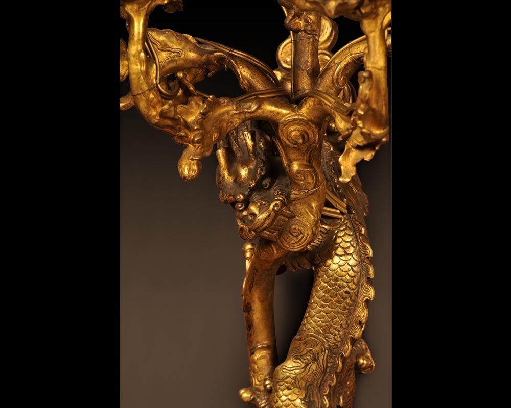 Un dragon de style chinois, au corps élancé, s'enroule gracieusement autour d'une branche de feuillages stylisés, fruit d'une inspiration extrême-orientale, et plus particulièrement chinoisante, très en vogue à la fin du XIXè s. L'ouverture de l'Asie sur le monde occidental, par le biais des participations aux Expositions Universelles et des collections d'amateurs fortunés, tels Henri Cernuschi ou l'impératrice Eugénie qui installe à Fontainebleau un musée chinois, détermine un répertoire décoratif très apprécié, dont les créateurs du XIXe s. s'inspirent pour proposer à leur clientèle des objets d'une grande élégance.