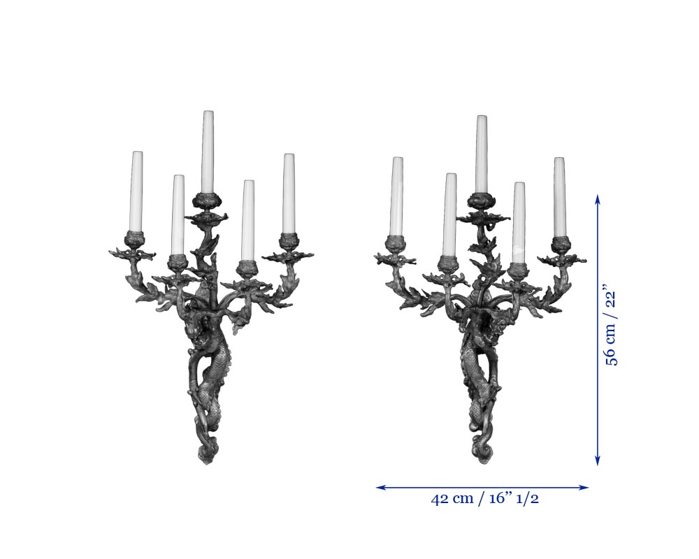 "Les dragons" Rare paire d'appliques japonisante en bronze doré