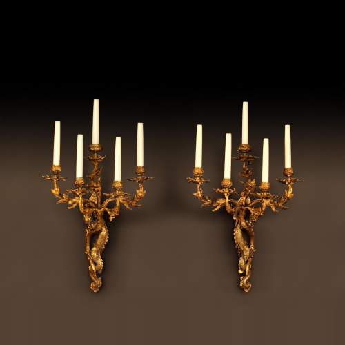 Belle paire d’appliques en fonte à patine bronze réalisés d’après des modèles du pont Alexandre III à Paris.